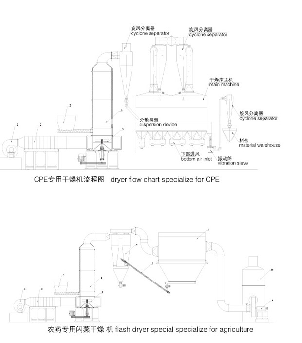 熱空氣由入口管以適宜的噴動速度從干燥機底部進入攪拌粉碎干燥室,對物料產(chǎn)生強烈的剪切、吹浮、旋轉(zhuǎn)作用,于是物料受到離心、剪切、碰撞、摩擦而被微粒化,強化了傳質(zhì)傳熱。在干燥機底部,較大較濕的顆粒團在攪拌器的作用下被機械破碎,濕含量較低、顆粒度較小的顆粒被旋轉(zhuǎn)氣流夾帶上升,在上升過程中進一步干燥。由于氣固兩相作旋轉(zhuǎn)流動,固相慣性大于氣相,固氣兩相間的相對速度較大,強化兩相間的傳質(zhì)傳熱,所以該機生產(chǎn)強度高。