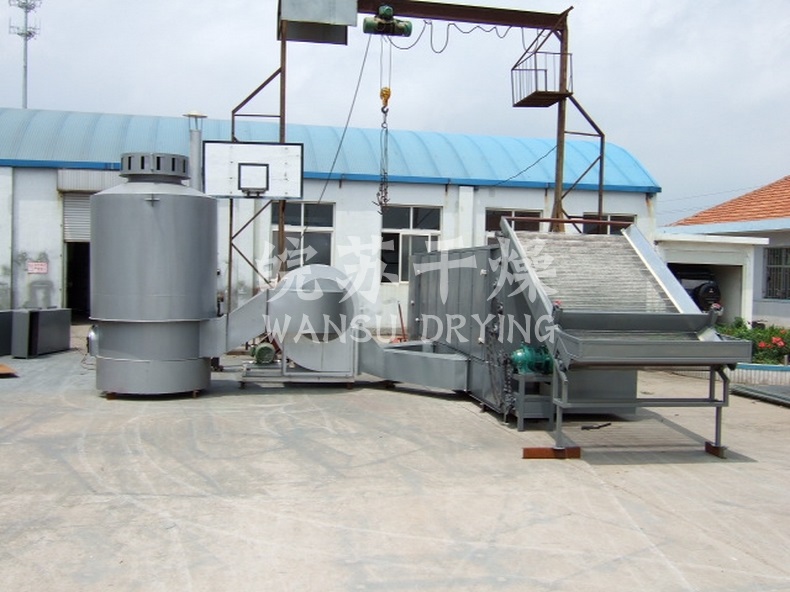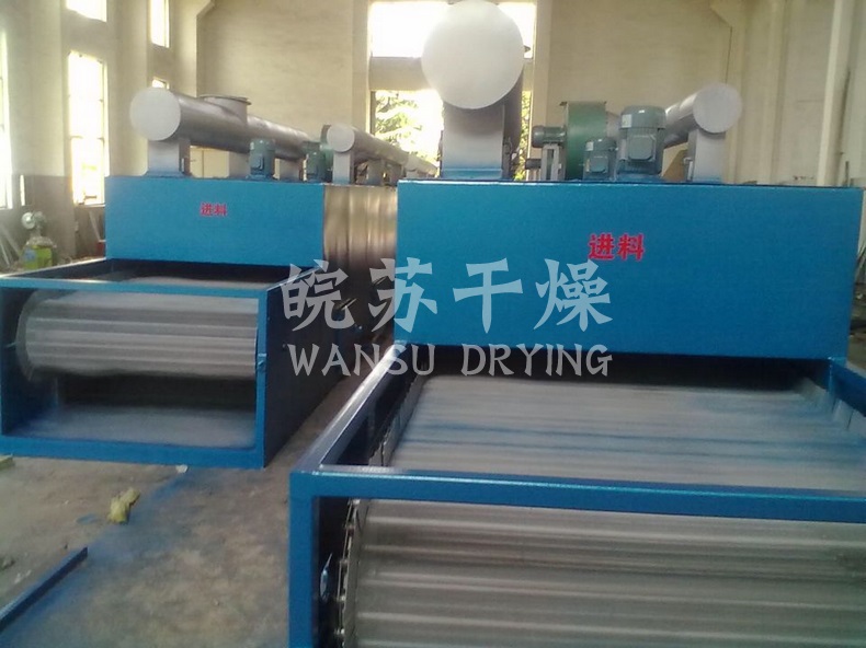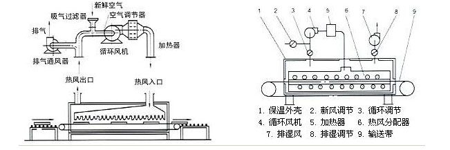 DWP型屬噴射氣流帶式干燥類型,熱風(fēng)以狹縫流或孔束流向下或上下同時噴向輸送帶上的物料,由于噴射氣帶高達(dá)15m/s以上,故對流傳熱的傳熱膜極薄,傳熱系數(shù)大,干燥速度快。該設(shè)備用于不透氣類物料時,上面噴射氣流仍返回上面,下面噴出的氣體仍返出下面,再參與循環(huán)。對透氣性物料如涂膜布干燥等,也適用于片狀物料及一些特殊物料的干燥。如果采用雙向氣流噴射,板材之類物料干燥后變形小。噴射氣流干燥使用熱源可以是蒸氣、電、熱風(fēng)爐及燃油煙道氣等