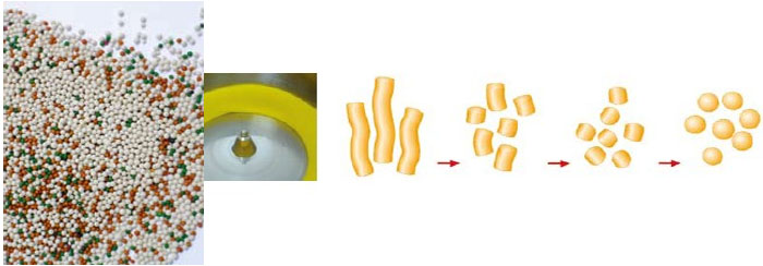 本系統(tǒng)是通過(guò)將粉體物料與粘合劑混合,制成適宜的軟材, 再將軟材擠壓成柱狀顆粒后放入球形拋丸機(jī)制成圓球度極高的球形顆粒,最后用干燥設(shè)備干燥掉多余水份,取得所需要的球形顆粒。
